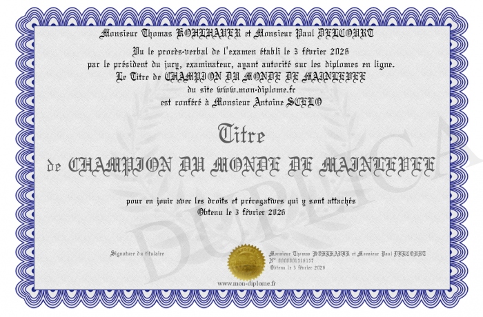 Envoyez par email votre Titre de CHAMPION DU MONDE DE MAINLEVEE personalisé