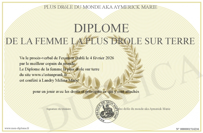 Envoyez par email votre Diplôme de la femme la plus drôle sur terre personalisé