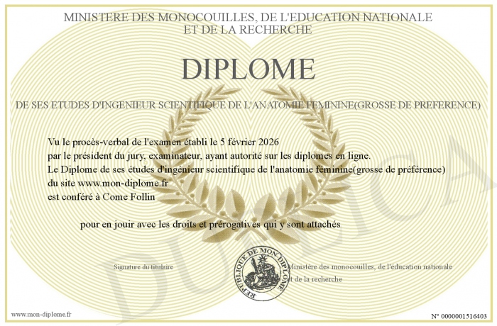 Envoyez par email votre Diplôme de ses études d'ingénieur scientifique de l'anatomie féminine(grosse de préférence) personalisé