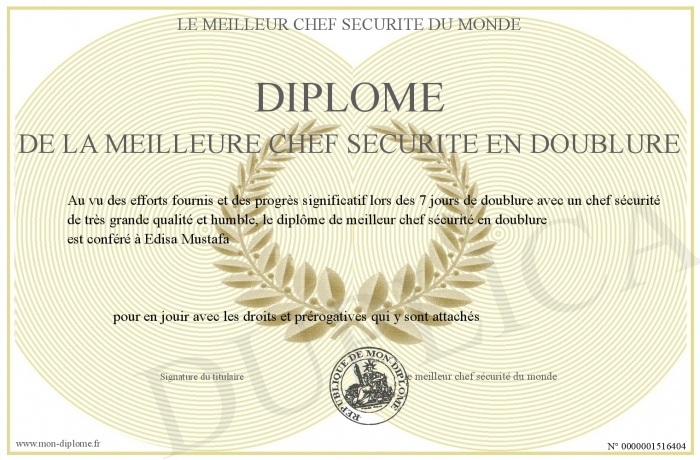 Envoyez par email votre Diplôme de la meilleure chef sécurité en doublure personalisé