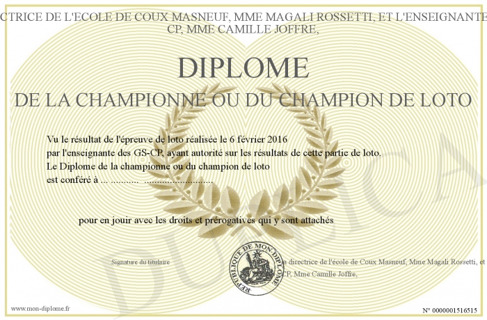 Envoyez par email votre Diplôme de la championne ou du champion de loto personalisé