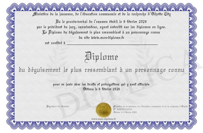 Envoyez par email votre Diplôme du déguisement le plus ressemblant à un personnage connu personalisé