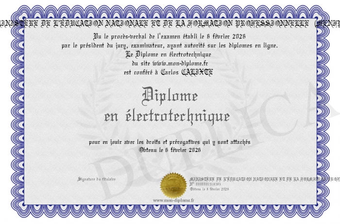 Envoyez par email votre Diplôme en électrotechnique personalisé