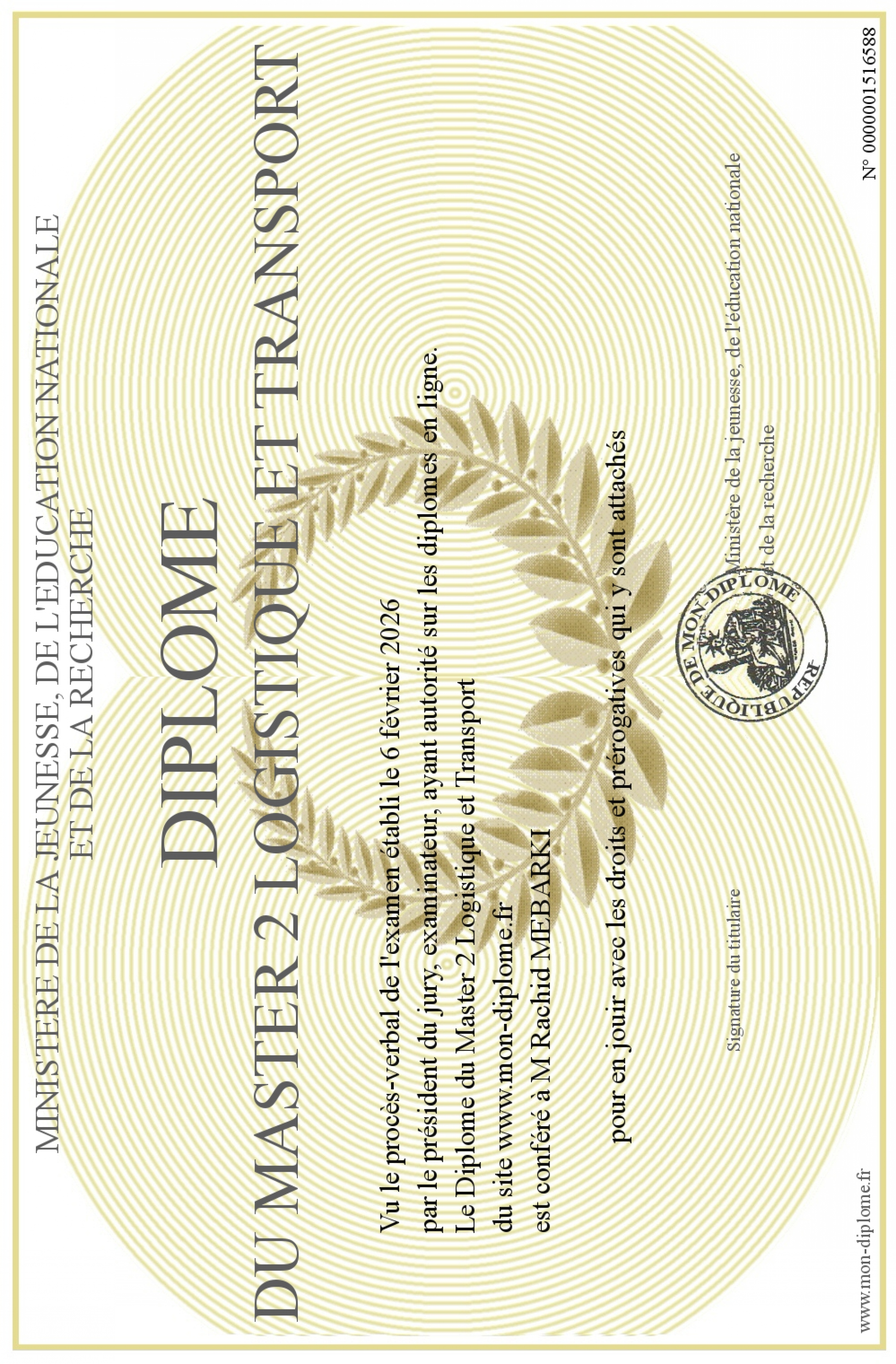 Envoyez par email votre Diplôme du Master 2 Logistique et Transport personalisé