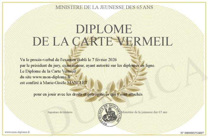 Envoyez par email votre Diplôme de la Carte Vermeil personalisé