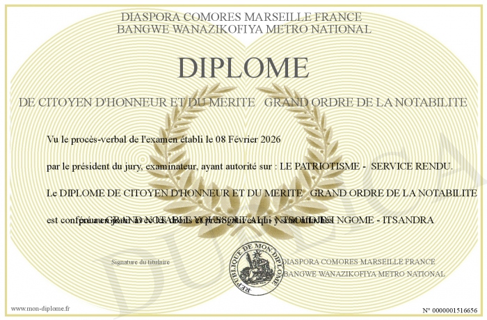 Envoyez par email votre DIPLOME DE CITOYEN D'HONNEUR ET DU MERITE GRAND ORDRE DE LA NOTABILITE personalisé