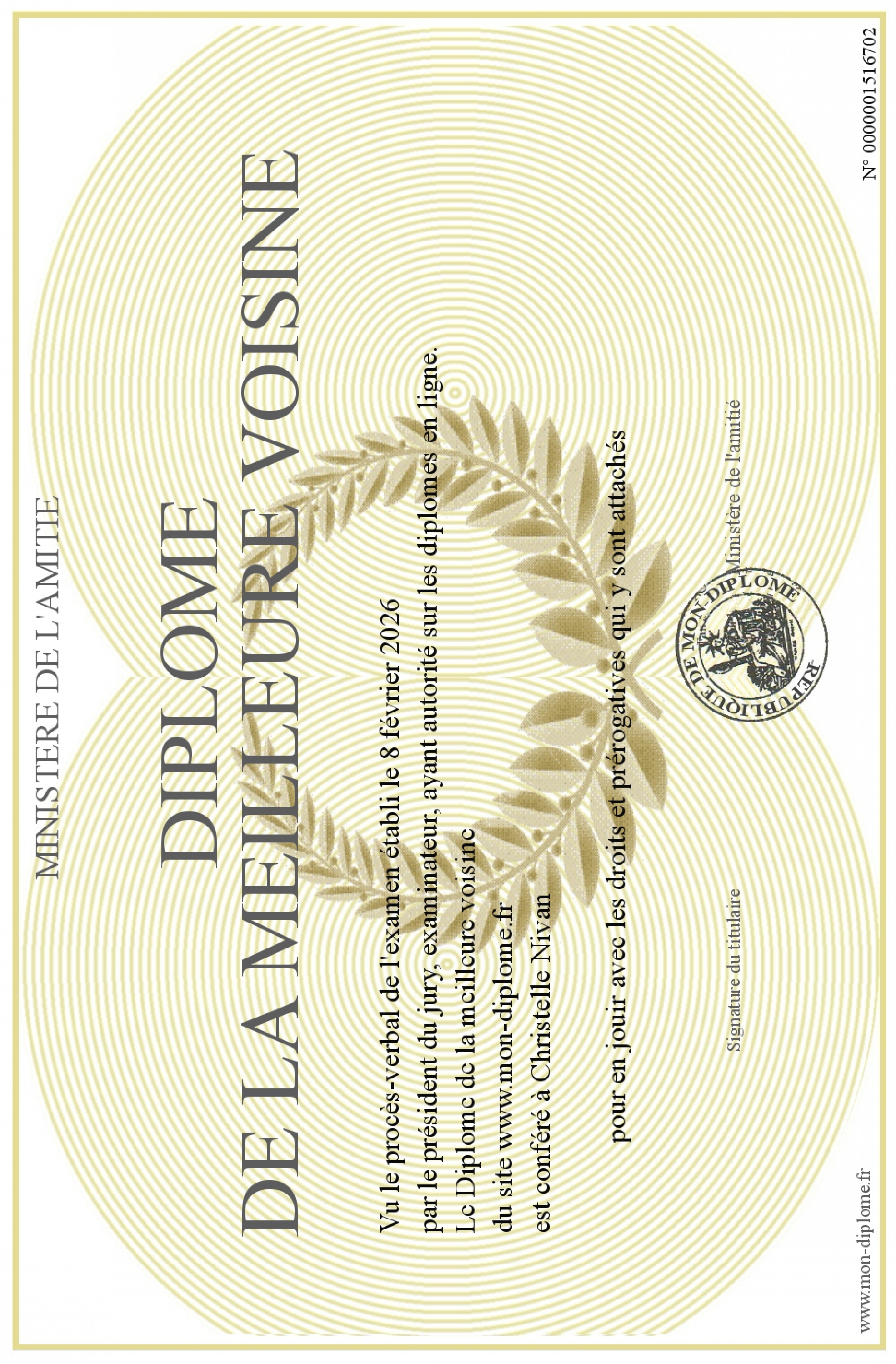 Envoyez par email votre Diplôme de la meilleure voisine personalisé