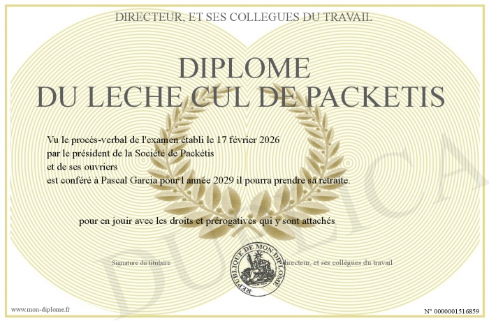 Envoyez par email votre Diplôme du lèche cul de Packétis personalisé