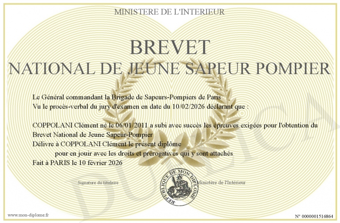 Envoyez par email votre Brevet National de Jeune Sapeur Pompier personalisé