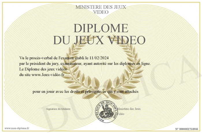 Envoyez par email votre Diplôme du Jeux vidéo personalisé