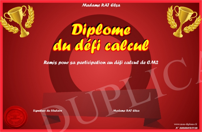 Envoyez par email votre Diplôme du défi calcul personalisé
