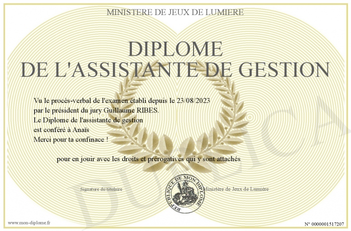 Envoyez par email votre Diplôme de l'assistante de gestion personalisé