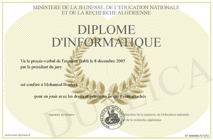 Envoyez par email votre Diplôme d'Informatique personalisé