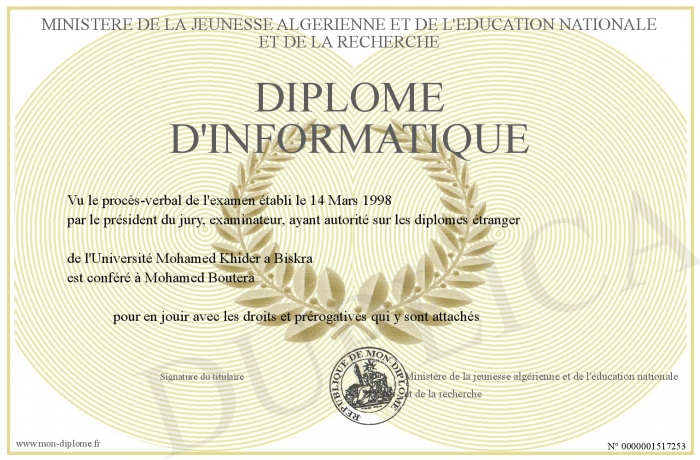 Envoyez par email votre Diplôme d'Informatique personalisé