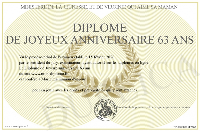 Envoyez par email votre Diplôme de Joyeux anniversaire 63 ans personalisé