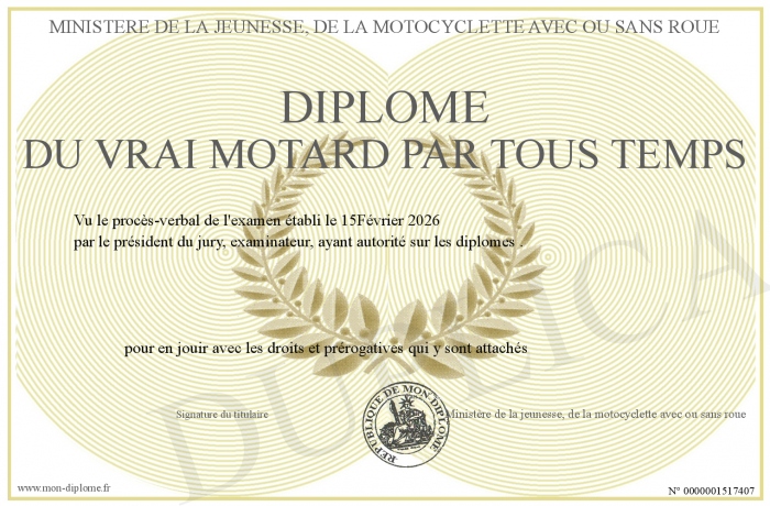 Envoyez par email votre Diplôme du Vrai motard par tous temps personalisé