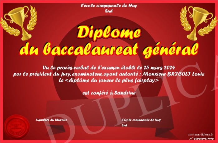 Envoyez par email votre Diplôme du baccalaureat général personalisé