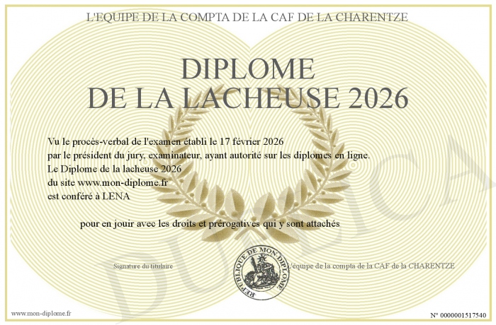 Envoyez par email votre Diplôme de la lacheuse 2026 personalisé