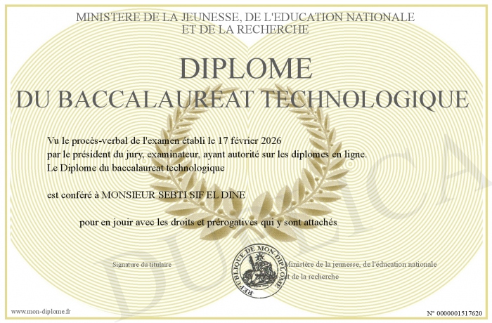 Envoyez par email votre Diplôme du baccalaureat technologique personalisé
