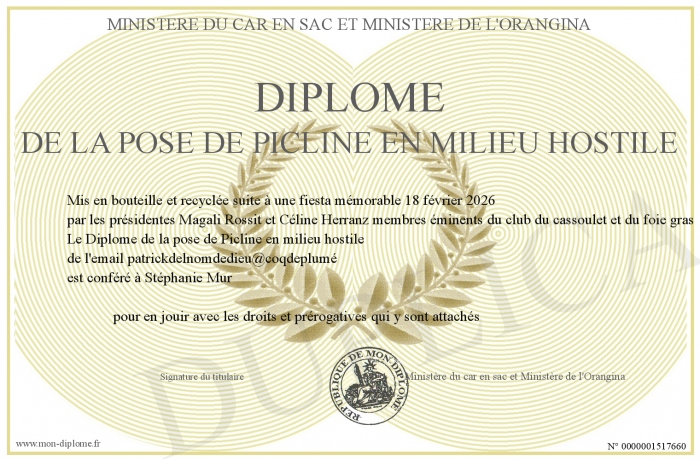 Envoyez par email votre Diplôme de la pose de Picline en milieu hostile personalisé