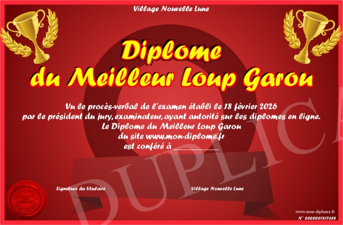 Envoyez par email votre Diplôme du Meilleur Loup Garou personalisé