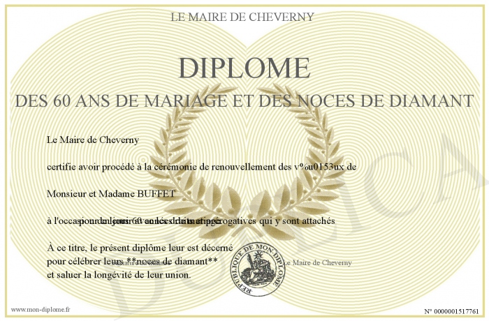 Envoyez par email votre Diplôme des 60 ans de Mariage et des Noces de Diamant personalisé