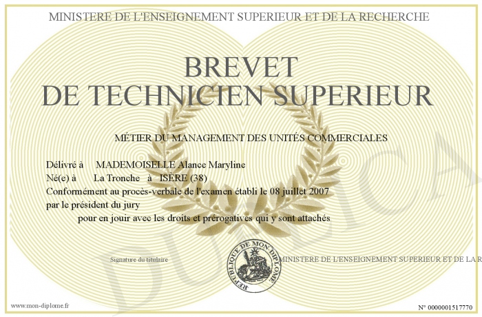 Envoyez par email votre BREVET DE TECHNICIEN SUPERIEUR personalisé