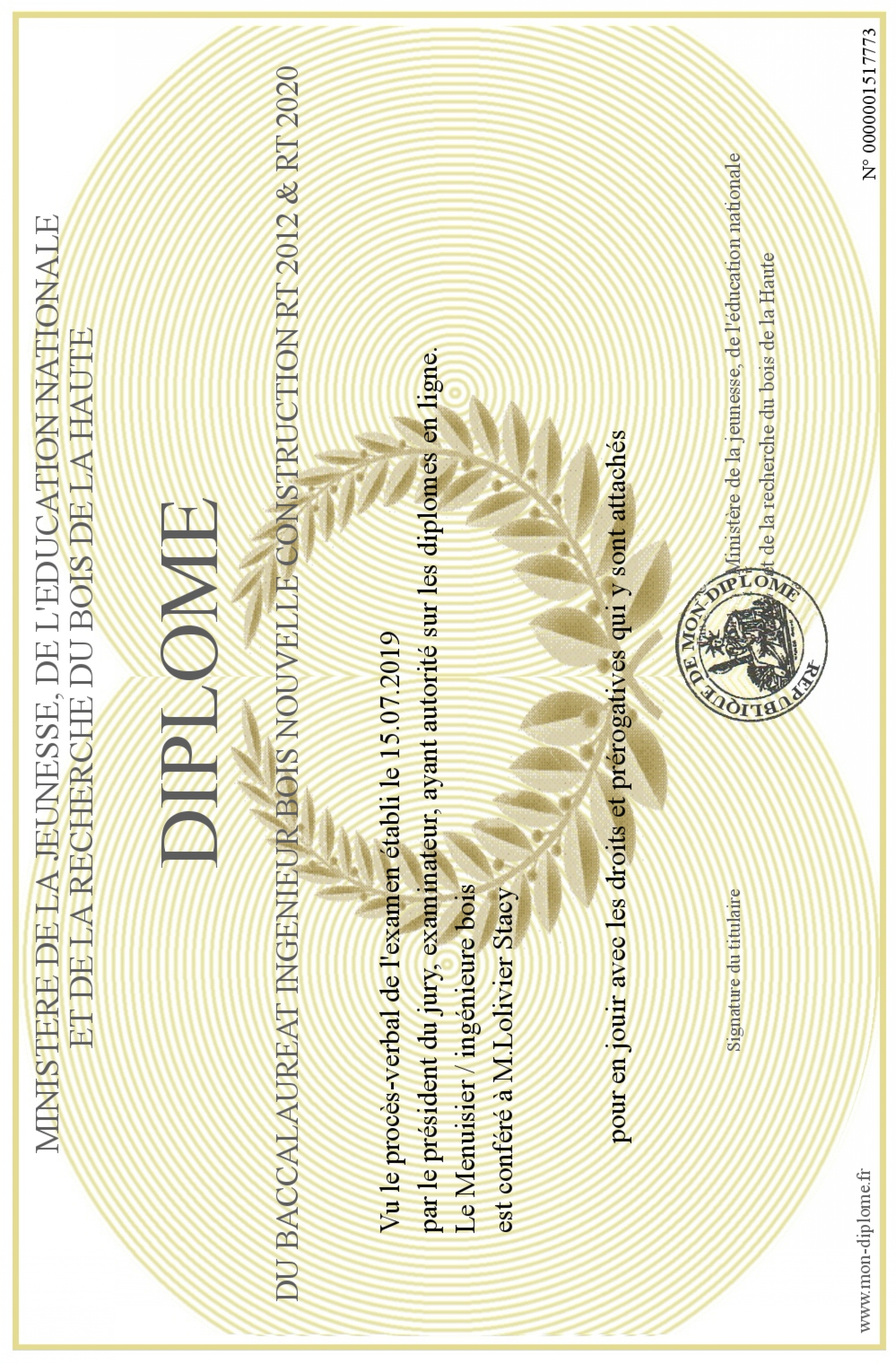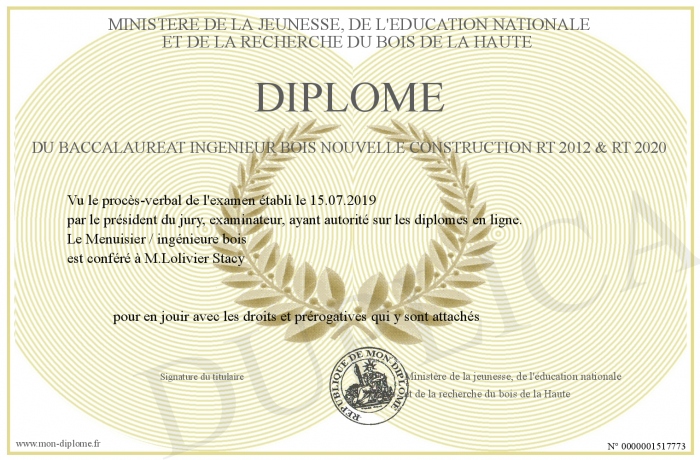 Envoyez par email votre Diplôme du baccalaureat Ingénieur bois Nouvelle construction RT 2012 & RT 2020 personalisé