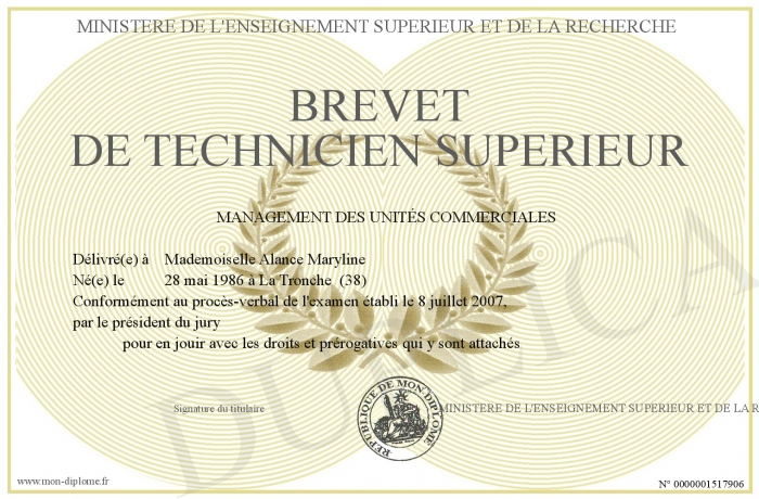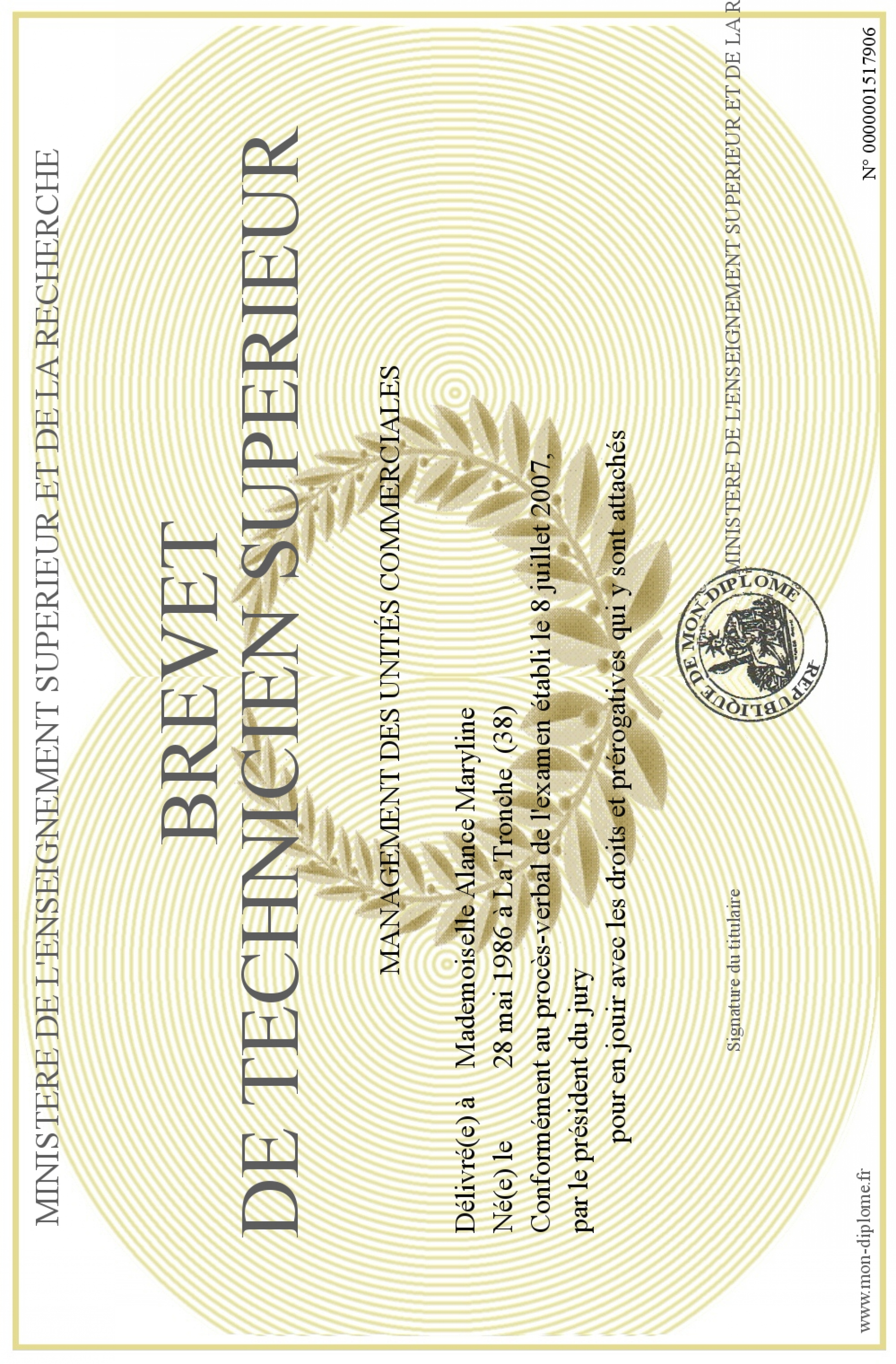 Envoyez par email votre BREVET DE TECHNICIEN SUPERIEUR personalisé