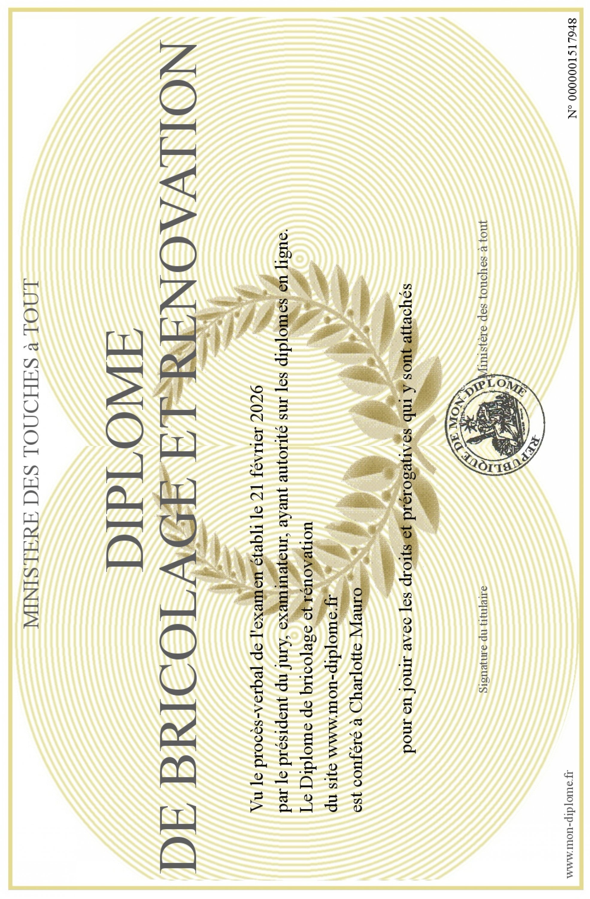 Envoyez par email votre Diplôme de bricolage et rénovation personalisé