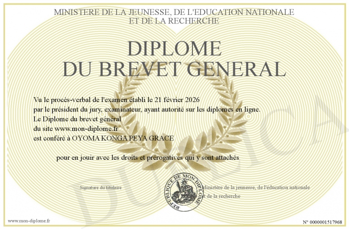 Envoyez par email votre Diplôme du brevet général personalisé