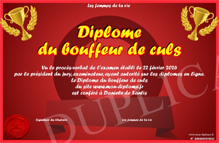 Envoyez par email votre Diplôme du bouffeur de culs personalisé