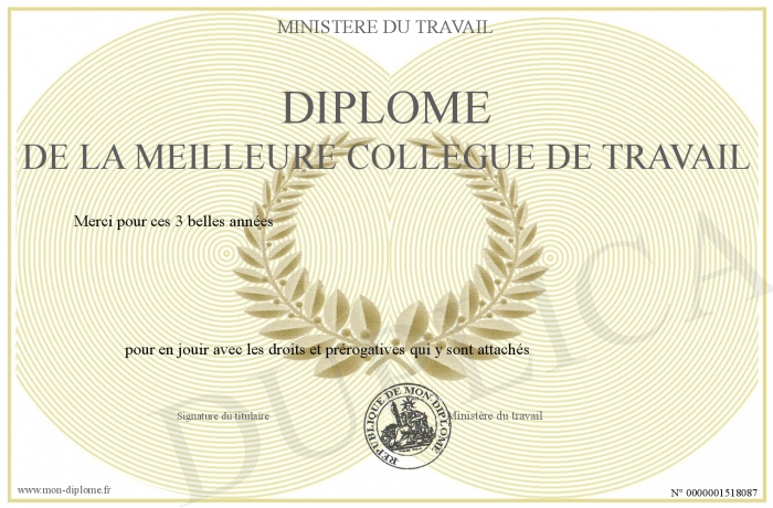 Envoyez par email votre Diplôme de la meilleure collègue de travail personalisé