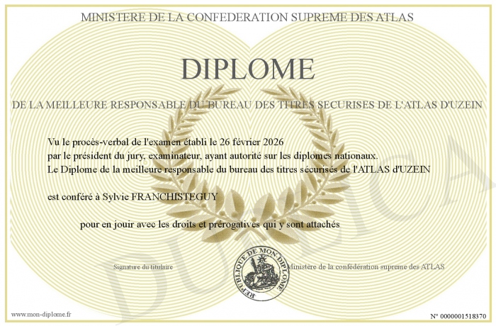 Envoyez par email votre Diplôme de la meilleure responsable du bureau des titres sécurisés de l'ATLAS d'UZEIN personalisé