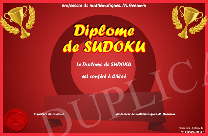 Envoyez par email votre Diplôme de SUDOKU personalisé