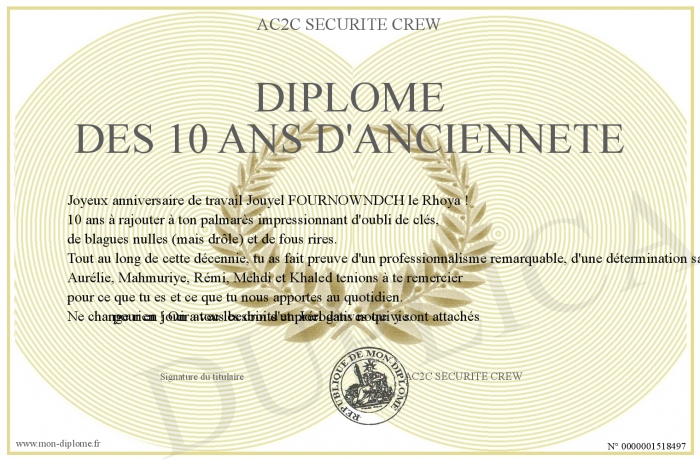Envoyez par email votre DIPLOME DES 10 ANS D'ANCIENNETE personalisé