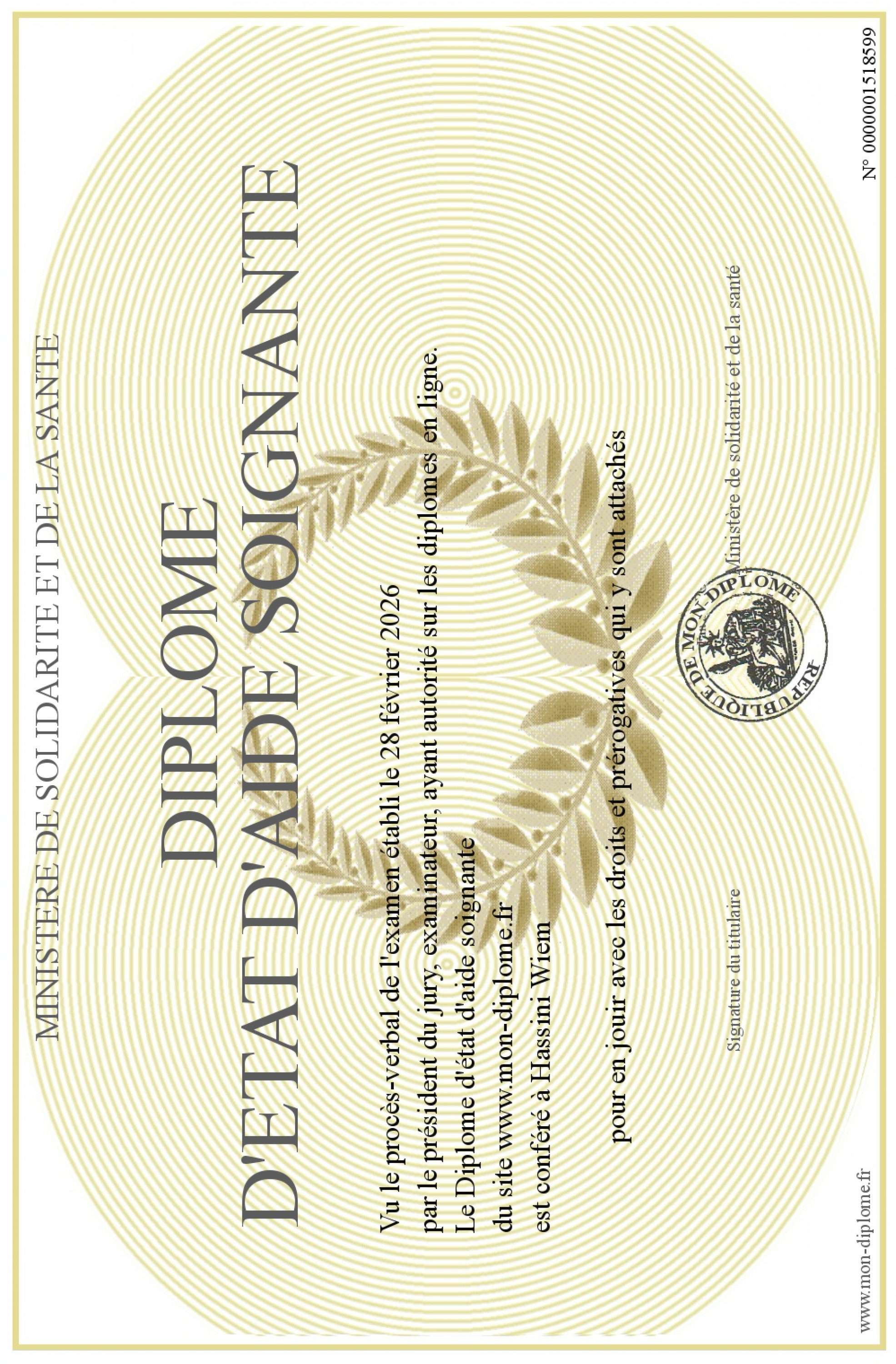 Envoyez par email votre Diplome d'état d'aide soignante personalisé