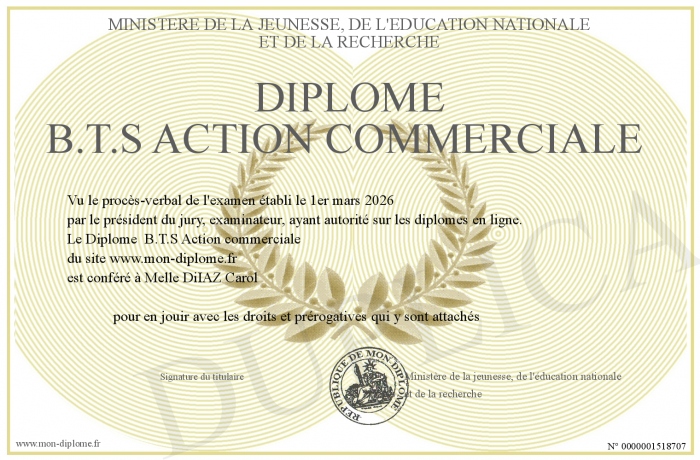 Envoyez par email votre Diplôme B.T.S Action commerciale personalisé