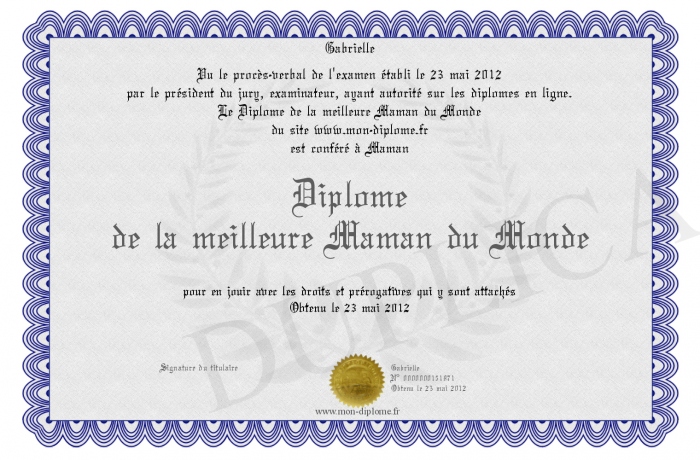 Envoyez par email votre Diplome de la meilleure Maman du Monde personalisé