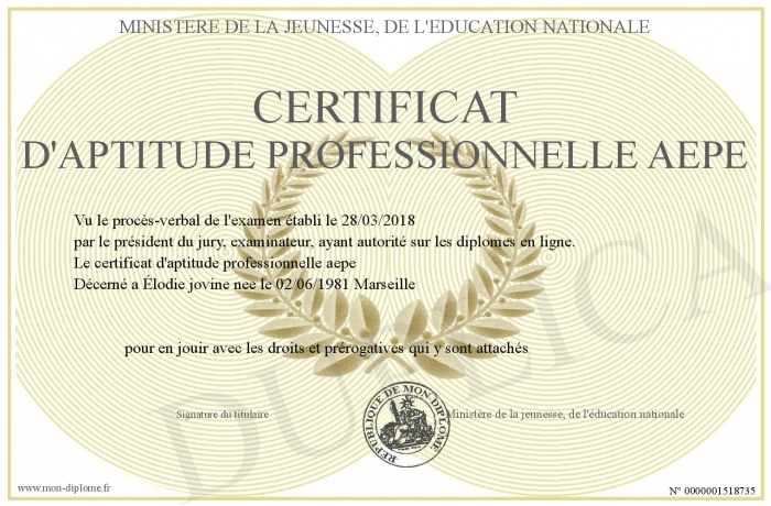 Envoyez par email votre Certificat d'aptitude professionnelle aepe personalisé