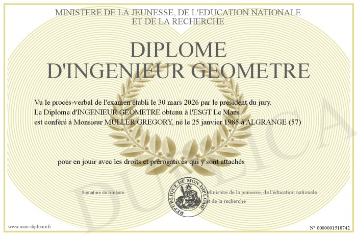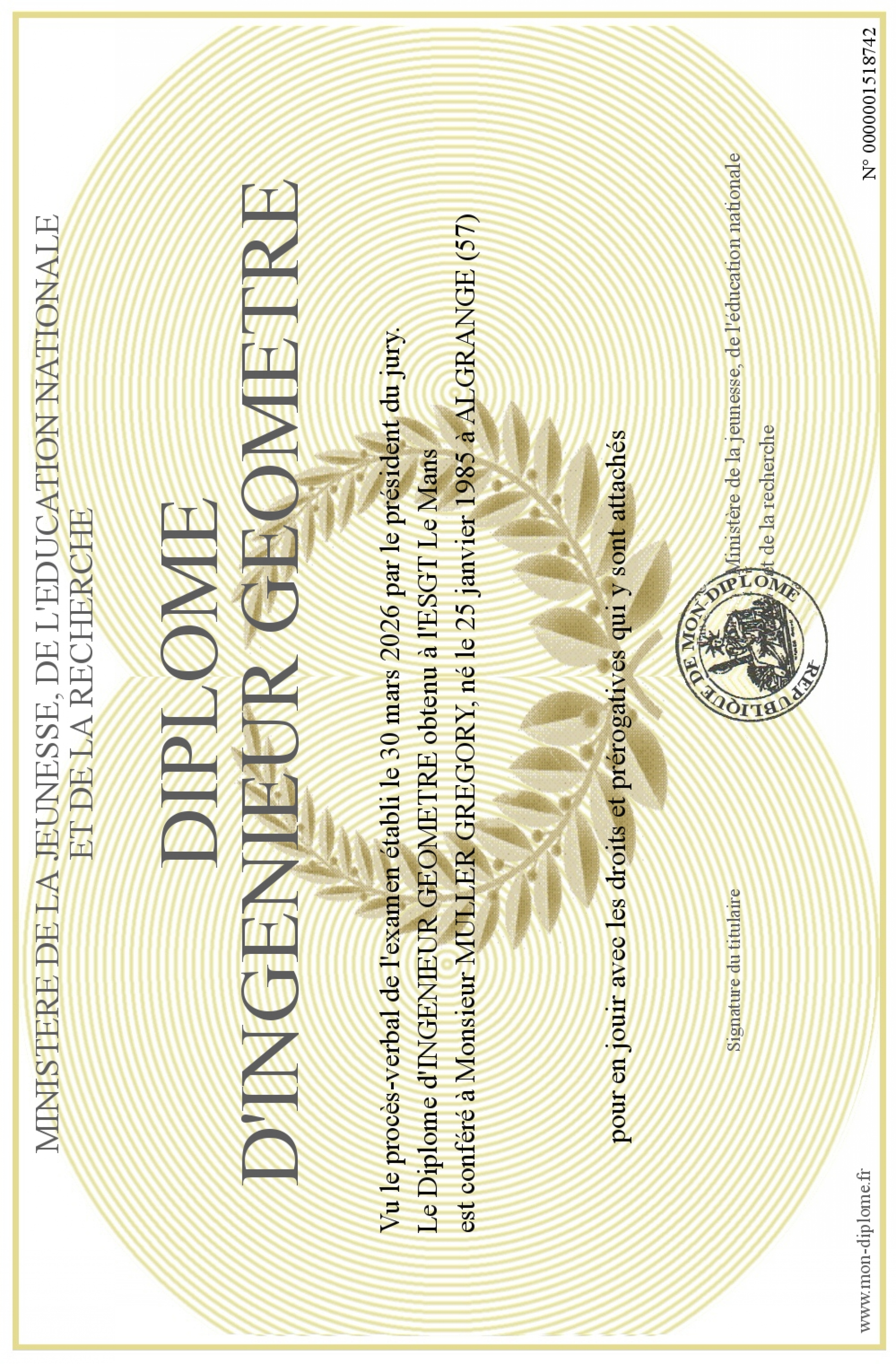 Envoyez par email votre Diplôme d'INGENIEUR GEOMETRE personalisé