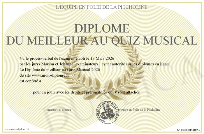 Envoyez par email votre Diplôme du meilleur au Quiz Musical personalisé