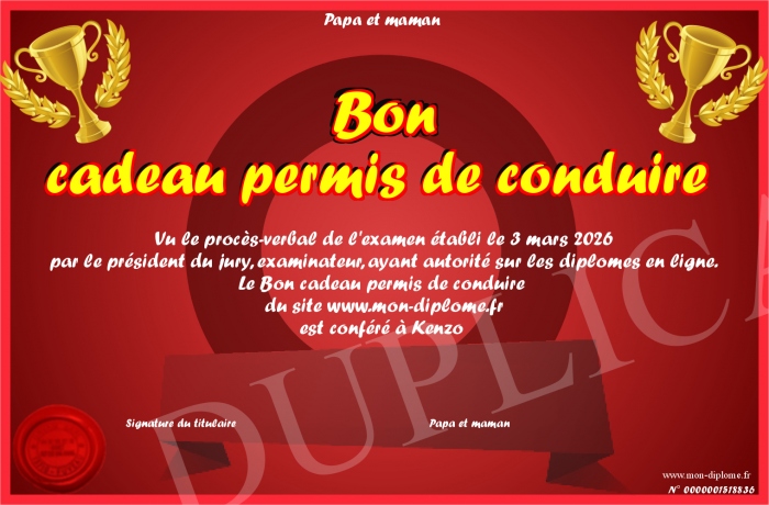 Envoyez par email votre Bon cadeau permis de conduire personalisé