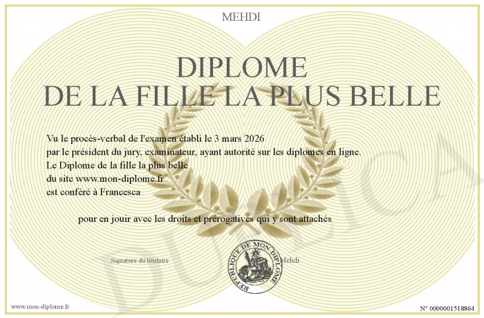 Envoyez par email votre Diplôme de la fille la plus belle personalisé