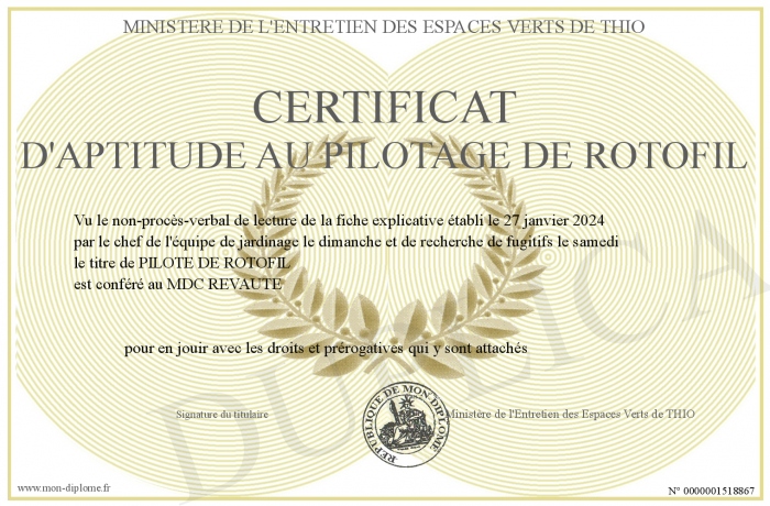 Envoyez par email votre Certificat d'aptitude au pilotage de rotofil personalisé