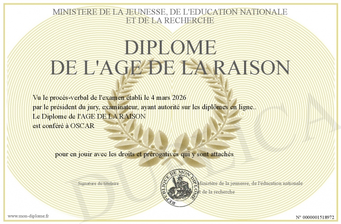 Envoyez par email votre Diplôme de l'AGE DE LA RAISON personalisé