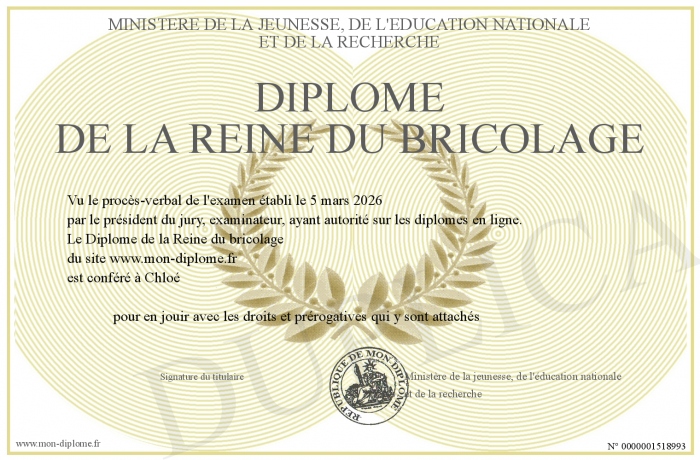 Envoyez par email votre Diplôme de la Reine du bricolage personalisé