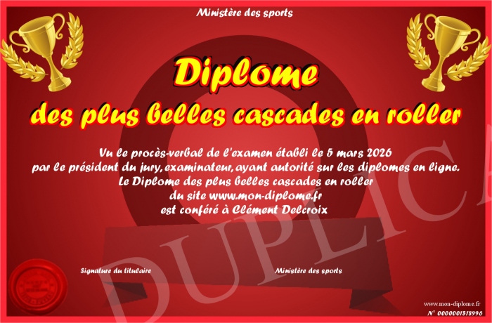 Envoyez par email votre Diplôme des plus belles cascades en roller personalisé