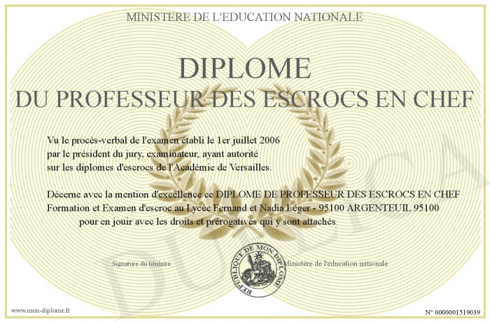 Envoyez par email votre Diplôme du PROFESSEUR DES ESCROCS EN CHEF personalisé