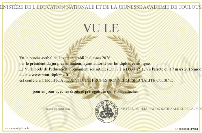 Envoyez par email votre Vu le code de l'éducation, notamment ses articles D337 1 à D337 25 1, Vu l'arrêté du 17 mars 2016 modifié portant création de la spécialité cuisine du certificat d'aptitude professionnelle et fixant ses modalités de délivrance: Le présent diplôme est délivré à M. EL ALAMI Yassir Né le 03 mai 2002, a ABIDJAN (COTE D'IVOIRE) Conformément au procès verbal de l'examen établi le 07 juillet 2023 par le président du jury personalisé